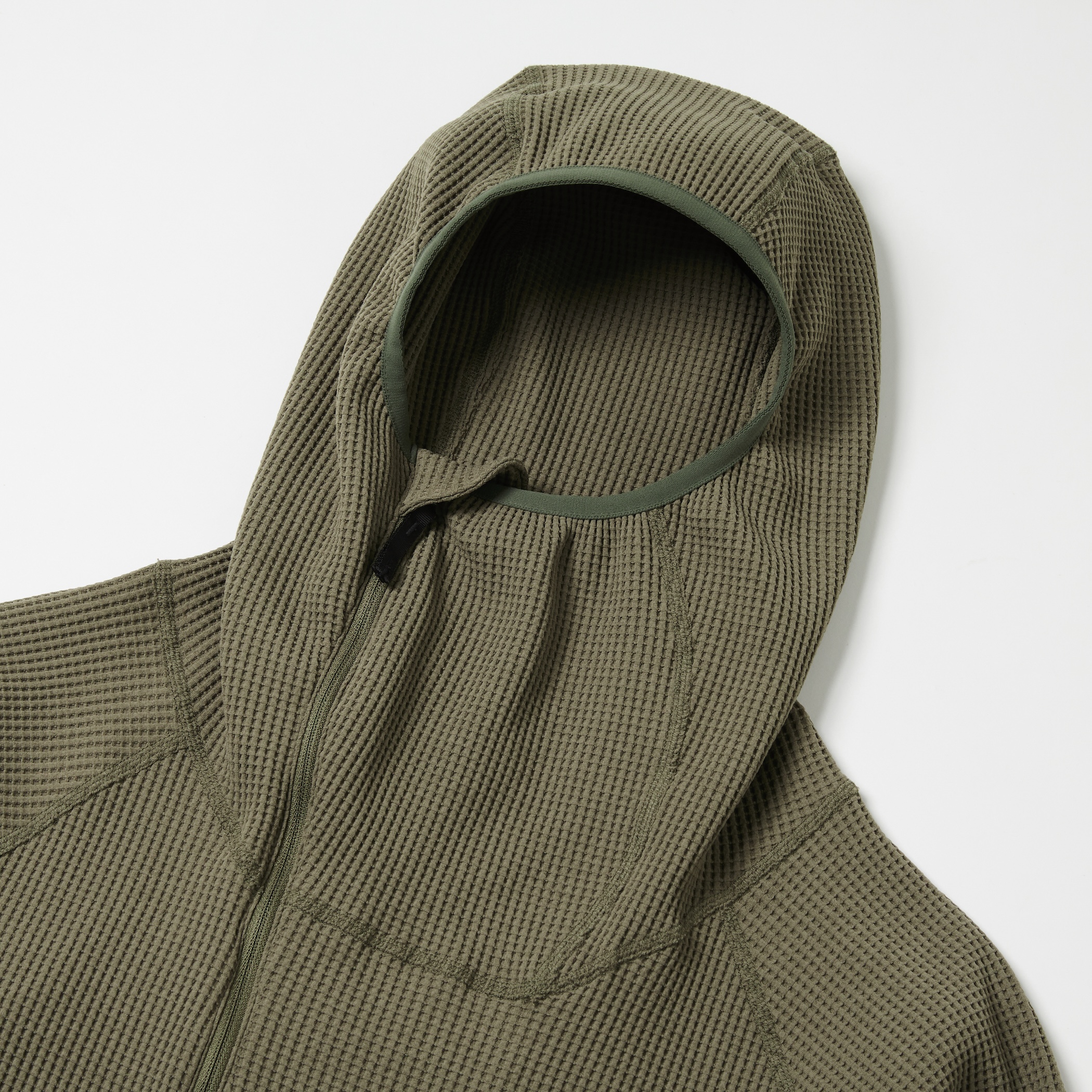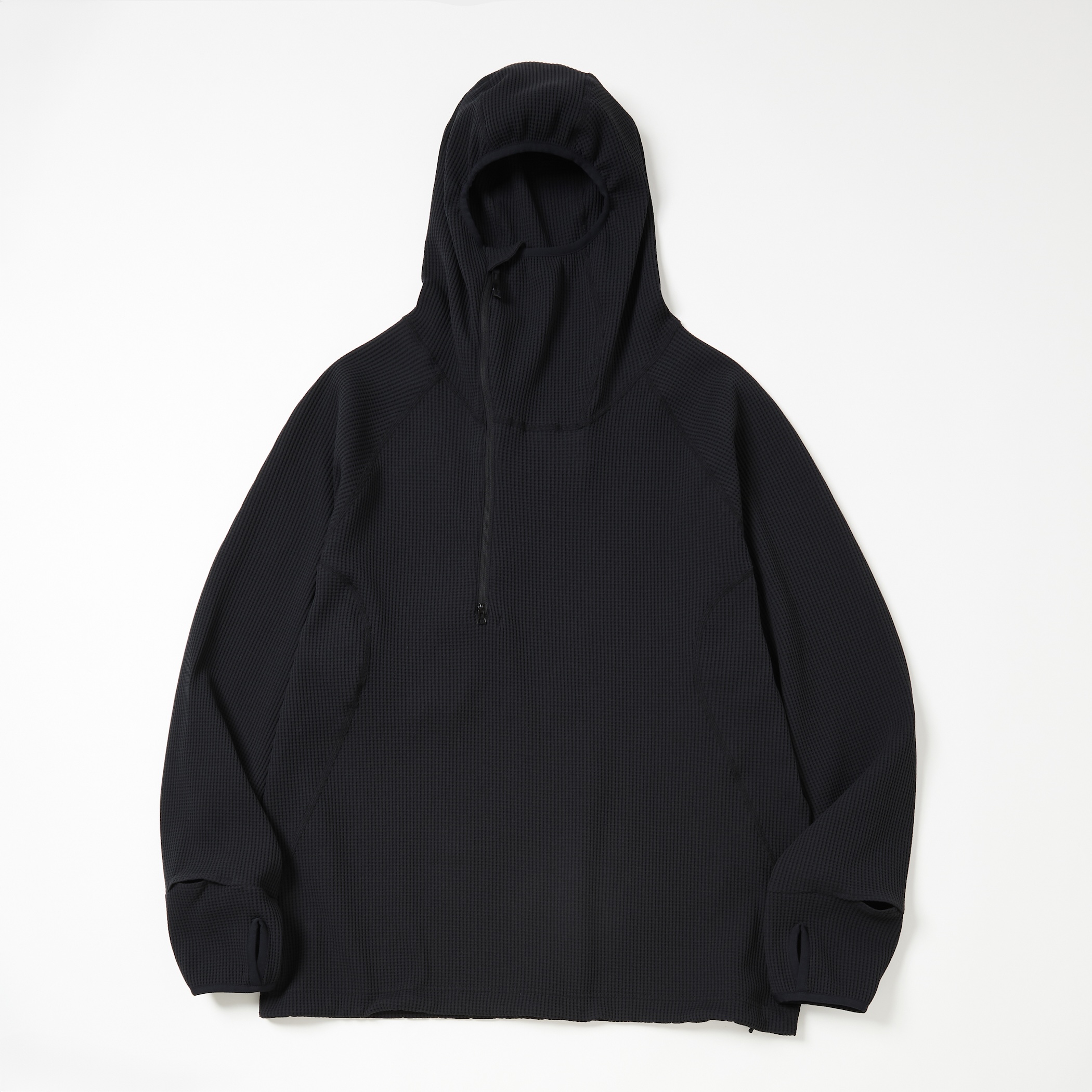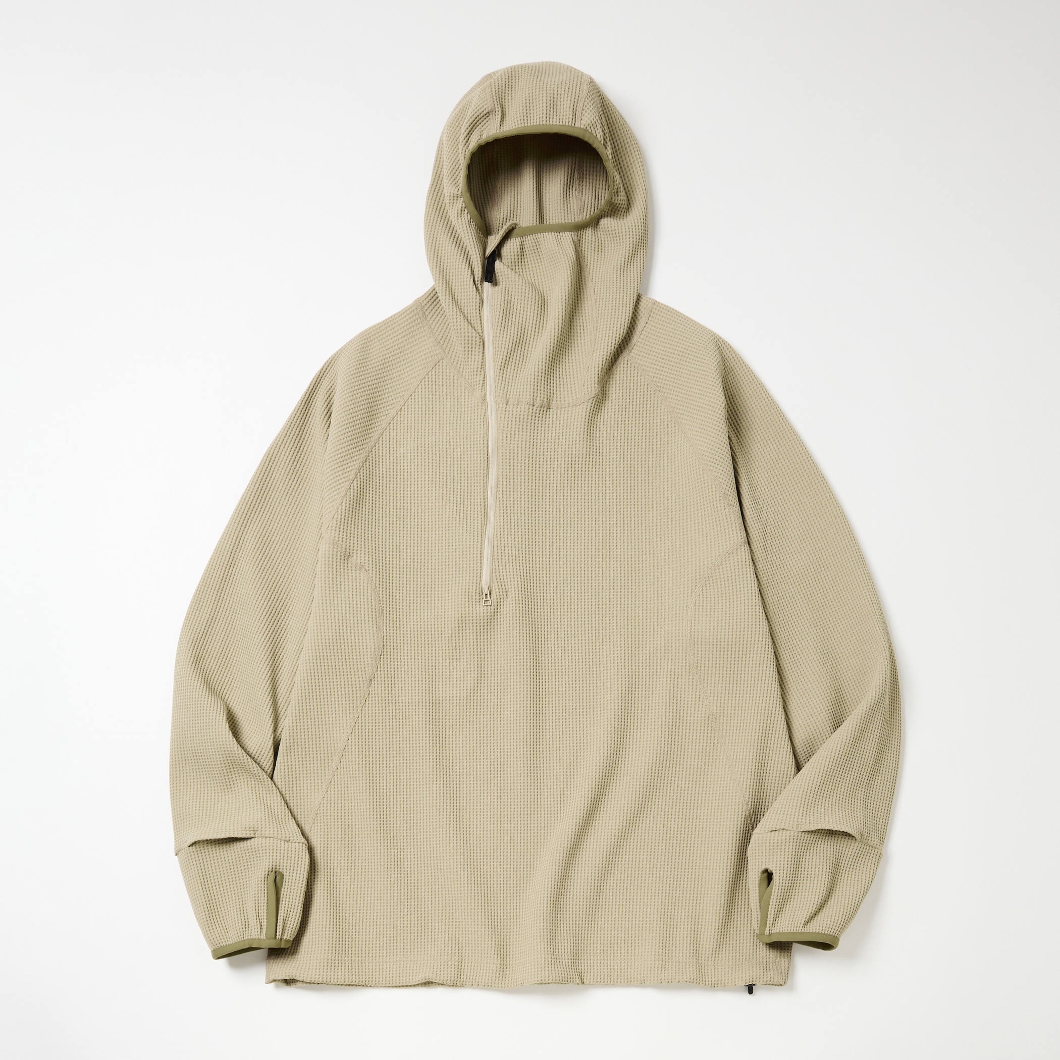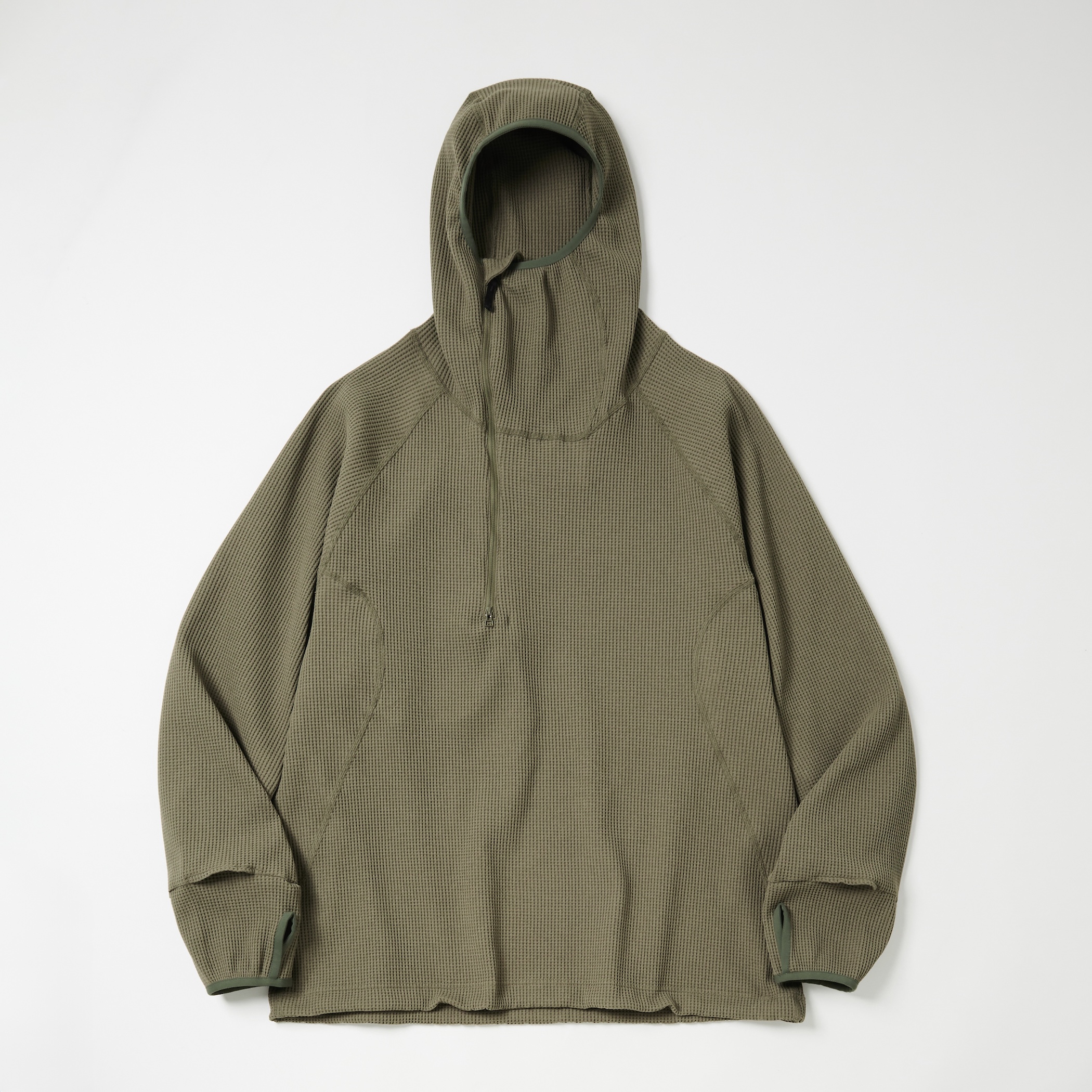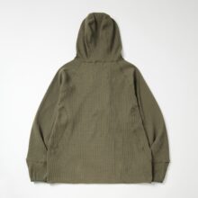 | 【Item Description】 「SOLOTEX」ワッフルを使用したジップアップフーディー。 着脱を考慮したハーフジップ仕様。 高めの襟によりバラクラバの様にフィットしたフードを採用。 素材のカッティングにより、ゆとりのあるサイズ感ではありながら すっきりとしたシルエットを生む。 裾はドローコードにより調節可能。 【Material】 表側には帝人フロンティアの開発した「SOLOTEX」を使用した 変形ワッフル素材を採用。 コイル形状でストレッチ性、キックバック性に優れている。 |